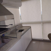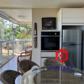 Sacada gourmet equipada com churrasqueira, pia, geladeira, forno elétrico, fechada e climatizada