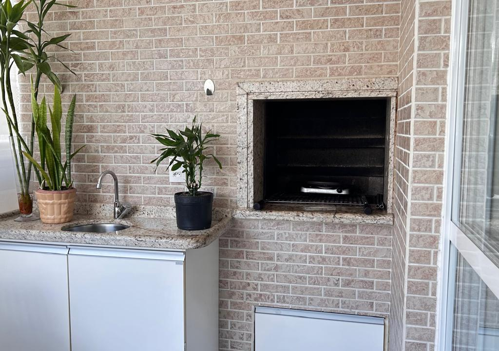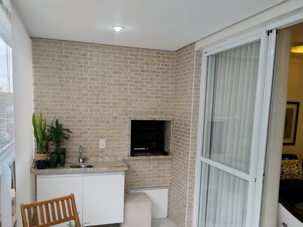 Sacada fechada com Sol da manhã, churrasqueira e pia
